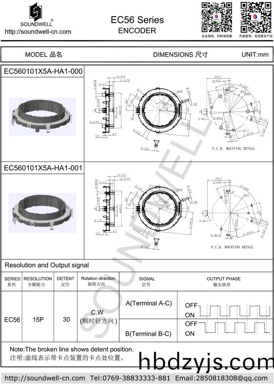 Dimensions: φ56mm Rated voltage: DC 5V Number of detent: 30 Pulses: 15 Working temperature: -40℃~85℃ Rotational life: 30,000 cycles Min |