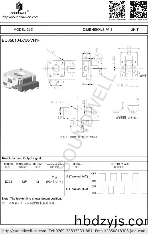 Rated voltage: DC 5V Number of detent: 12 Pulses: 12 Rotational torque: 30gf.cm Max Working temperature: -40℃~85℃ Rotational life: 100,000 cycles Min; |
