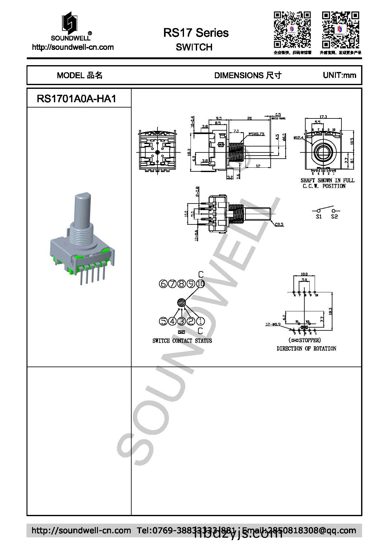| Main Specifications: | Dimensions: 17mm Number of positions: 2~9 Step angle: 30°±3° Rated power: DC16V 0.3A Contact resistance: 100mΩ Max Rotational torque: 100~600gf.cm Switch operating force: 250~650gf Operating temperature: -10℃ ~70℃ Operating life: 10,000 cycles Min |