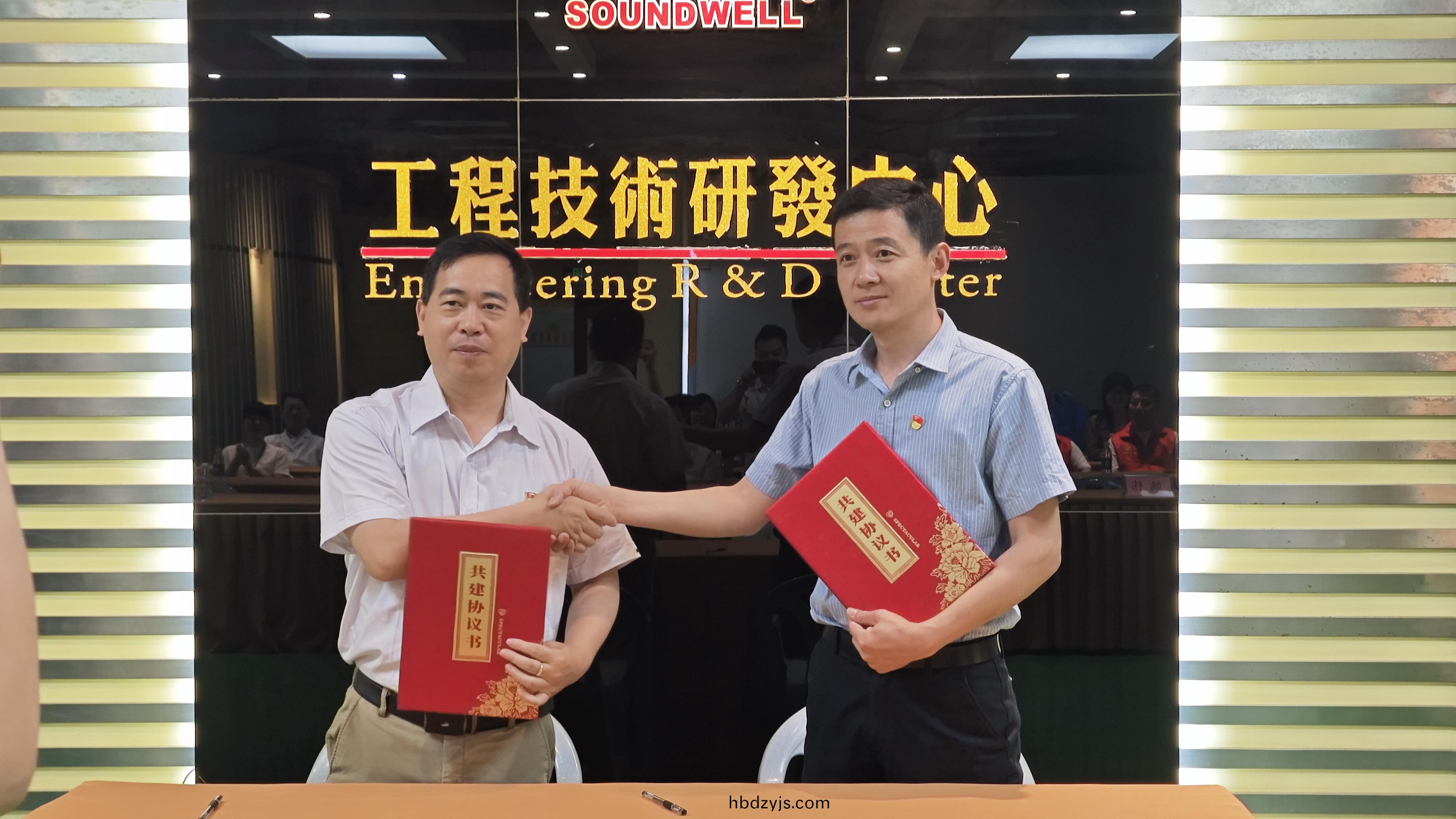廣東陞(sheng)威(wei)電子(zi)有(you)限公(gong)司代錶彭明(ming)亮(liang)書記、莞(guan)華(hua)醫(yi)院代(dai)錶(biao)姚(yao)偉(wei)書記上檯(tai)籤(qian)訂《黨(dang)建聯學共建(jian)、健康(kang)聯盟(meng)協(xie)議書(shu)》。